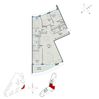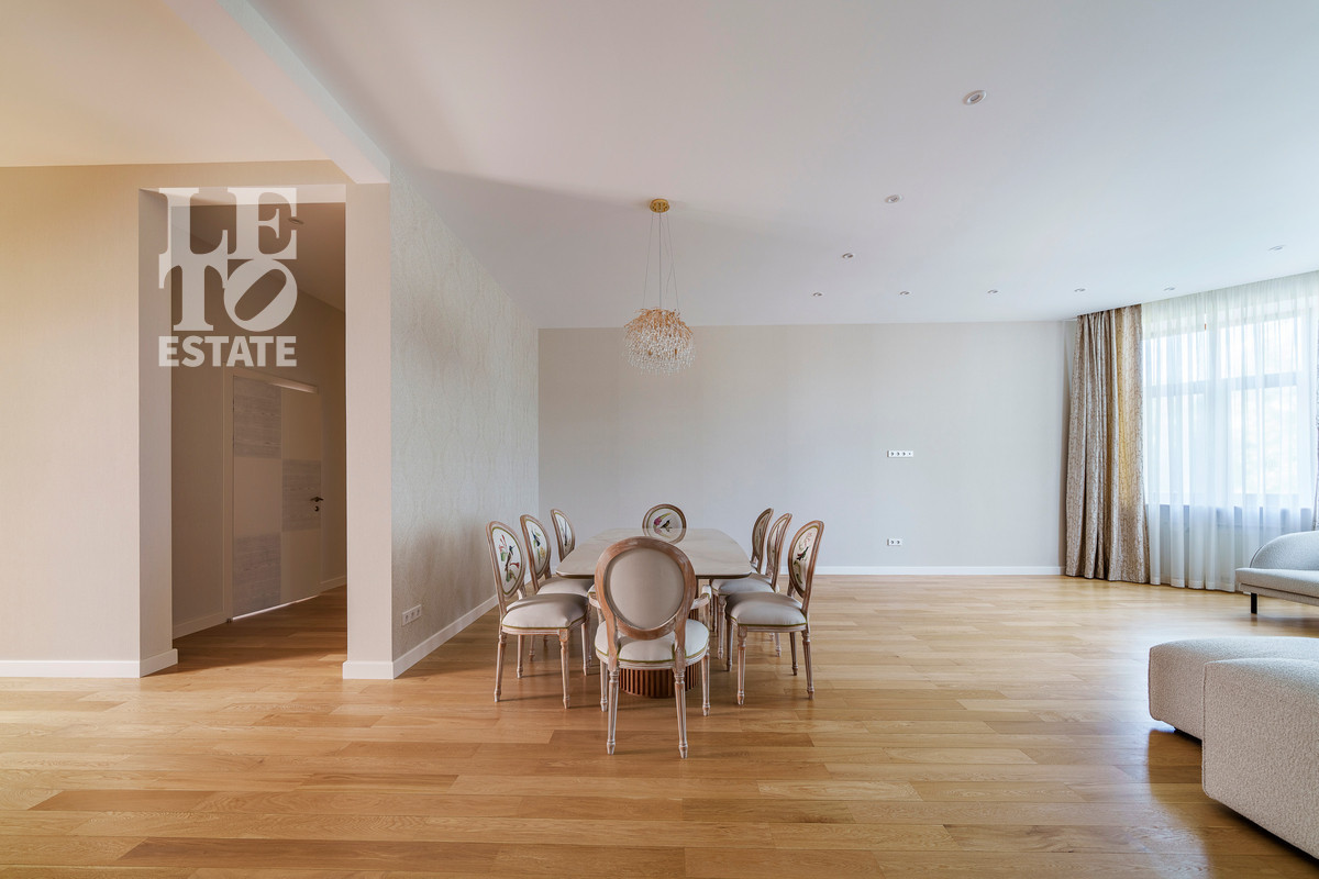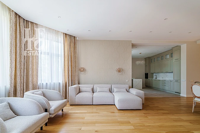В квартире выполнена высококачественная дизайнерская отделка под ключ с мебелью премиальных брендов. Кухонный гарнитур с каменной столешницей и встроенной бытовой техникой, двумя встроенными холодильниками и островом. В квартире несколько сценариев освещения.