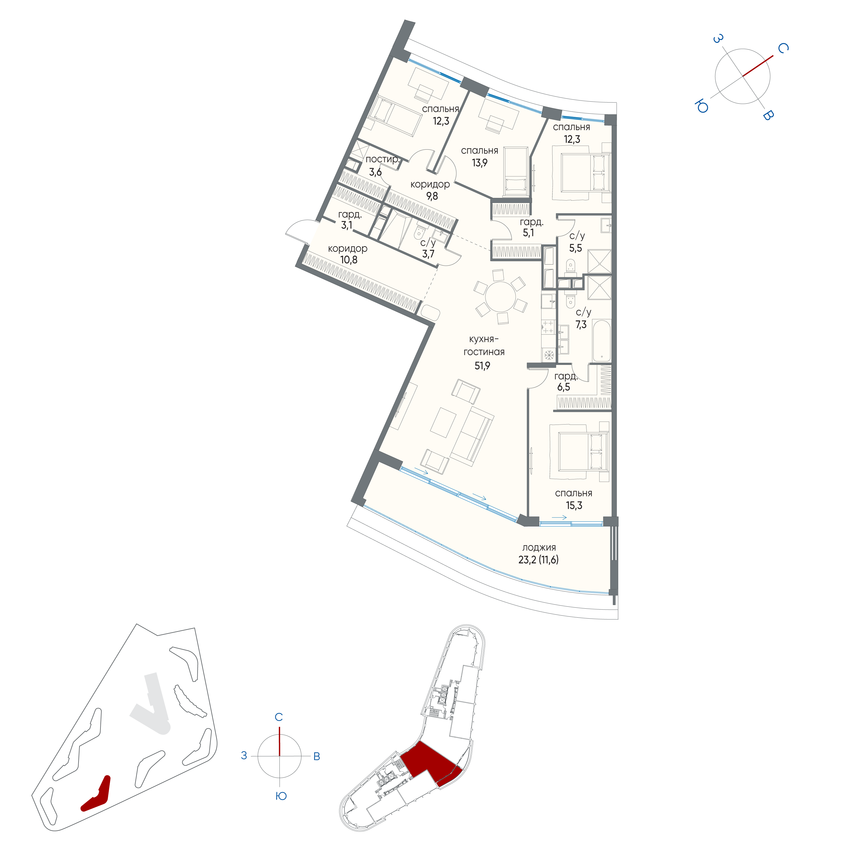 Планировка квартиры: холл, гостевой санузел, прачечная, кухня-гостиная с выходом на балкон, детская комната, спальня с санузлом с ванной, мастер-спальня с гардеробом и санузлом с душевой.