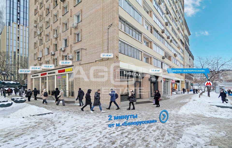 Центр Москвы. 1-2 минуты пешком до станции метро Белорусская и Белорусского вокзала.