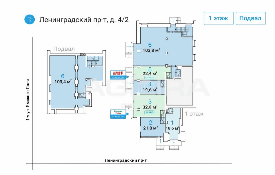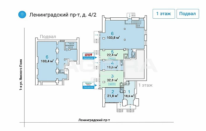 Аренда помещения свободного назначения площадью 212,5 кв.м (103,4 кв.м - подвал, 103,8 кв.м - 1 этаж) (блок № 6 на плане). Отдельный вход с фасада и запасной со двора, высота потолков 4 м на 1 эт, 2,3 м - в подвале, санузел, городские коммуникации. Планировка — свободная. Помещения под чистовую отделку.