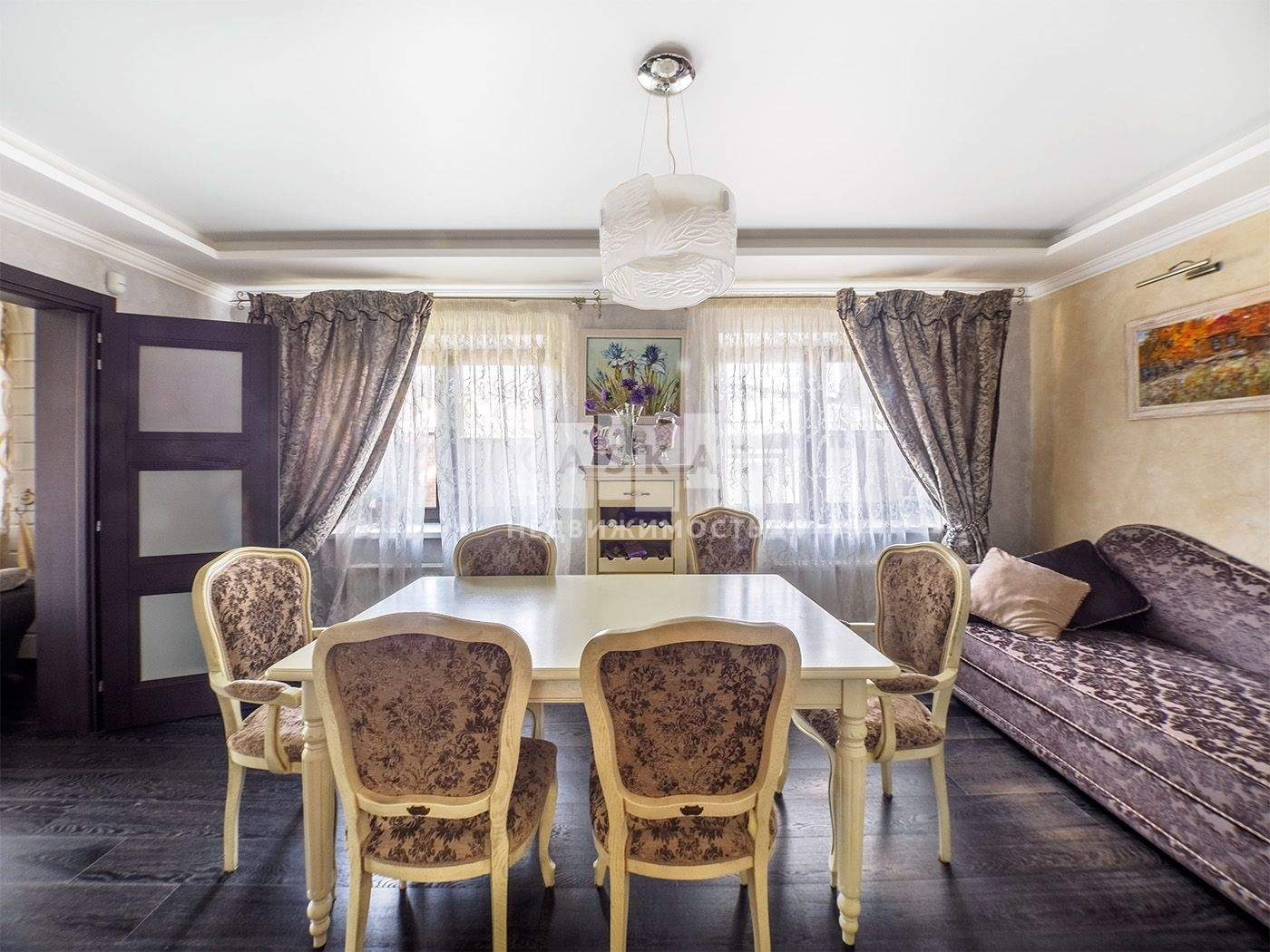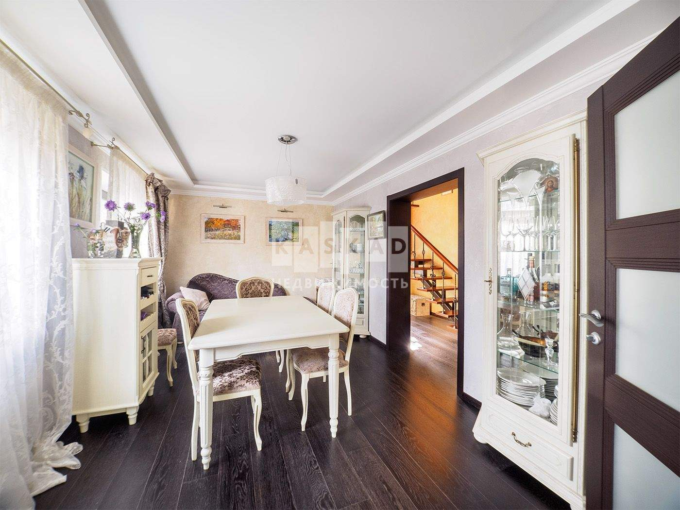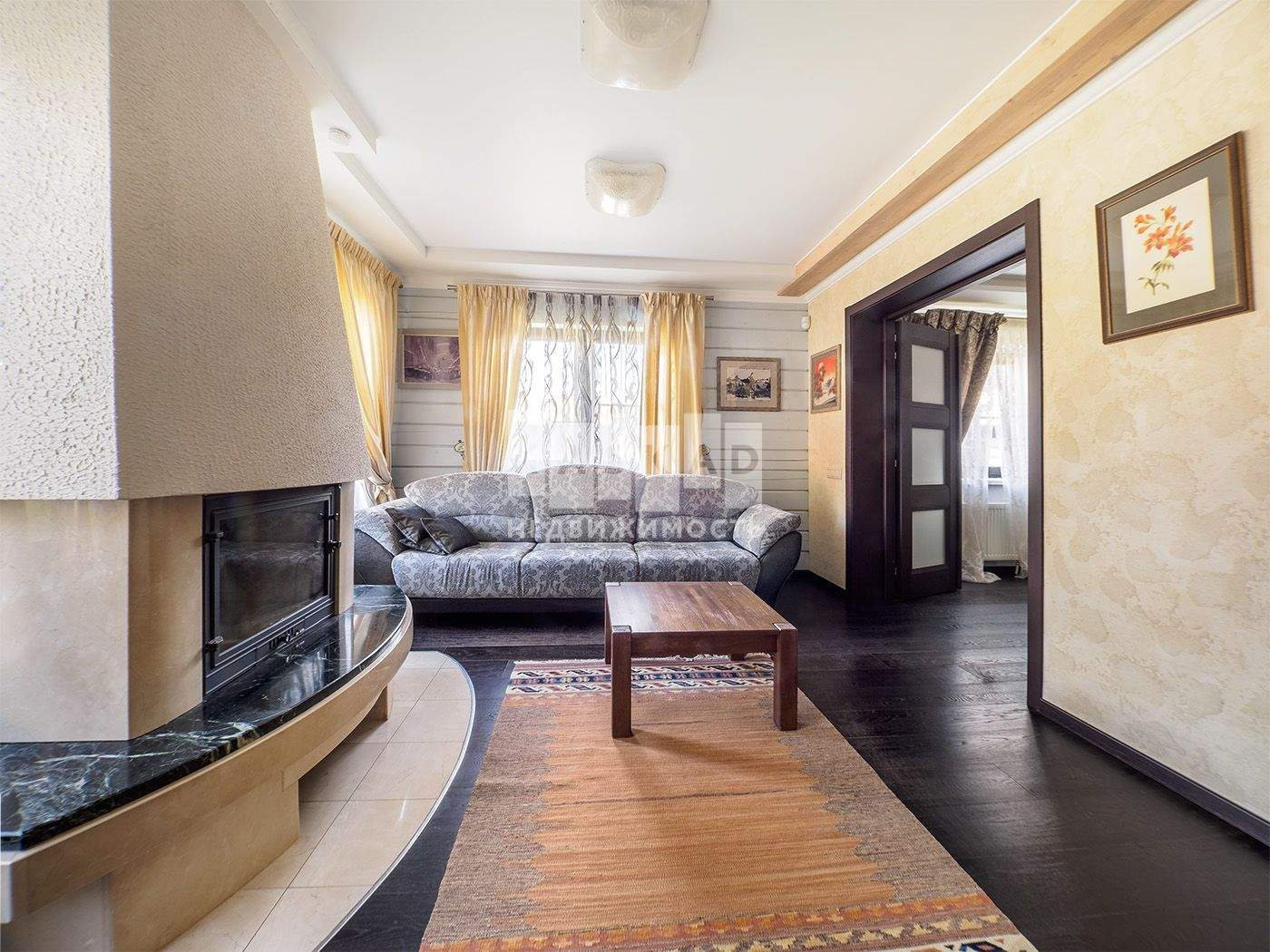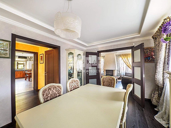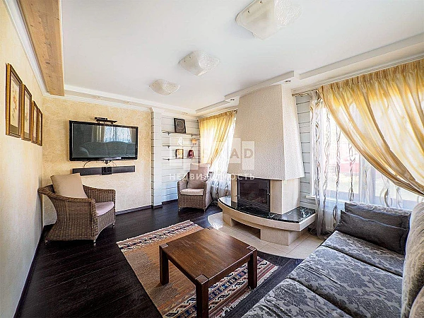 На первом этаже находится просторная кухня ( техника Bosch) гостиная, каминный зал, с/у со встроенной сауной и теплым полом.