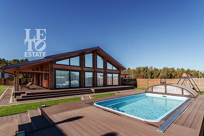 Благоустроенный участок, окружен деревянным забором и оформлен в соответствии с ландшафтным дизайном, установлены уличные фонари и вымощены дорожки. Дополнительно на территории расположены : уличный бассейн с подогревом , удобная мангальная зона примыкает к банному комплексу под навесом, спортивная площадка и качели – все располагает для отдыха и приятного времяпрепровождения.