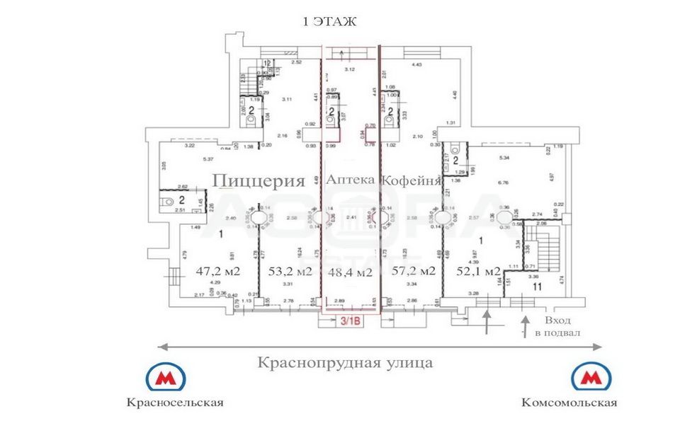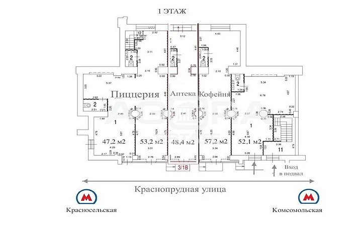 Аренда торгового помещения. Первая линия улицы Краснопрудная. Площадь 52,1 м2 (на плане - блок Б5), 1 этаж. Планировка зальная, витринные окна, отдельный вход с фасада, высокие потолки - 3.5м , все городские коммуникации. Электрическая мощность - по запросу. Размещение вывески на фасаде возможно.