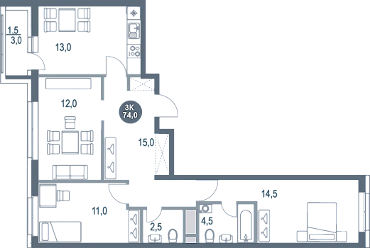 - Планировка: кухня, лоджия, гостиная, гостевой санузел, спальня, детская, ванная комната, второй санузел;