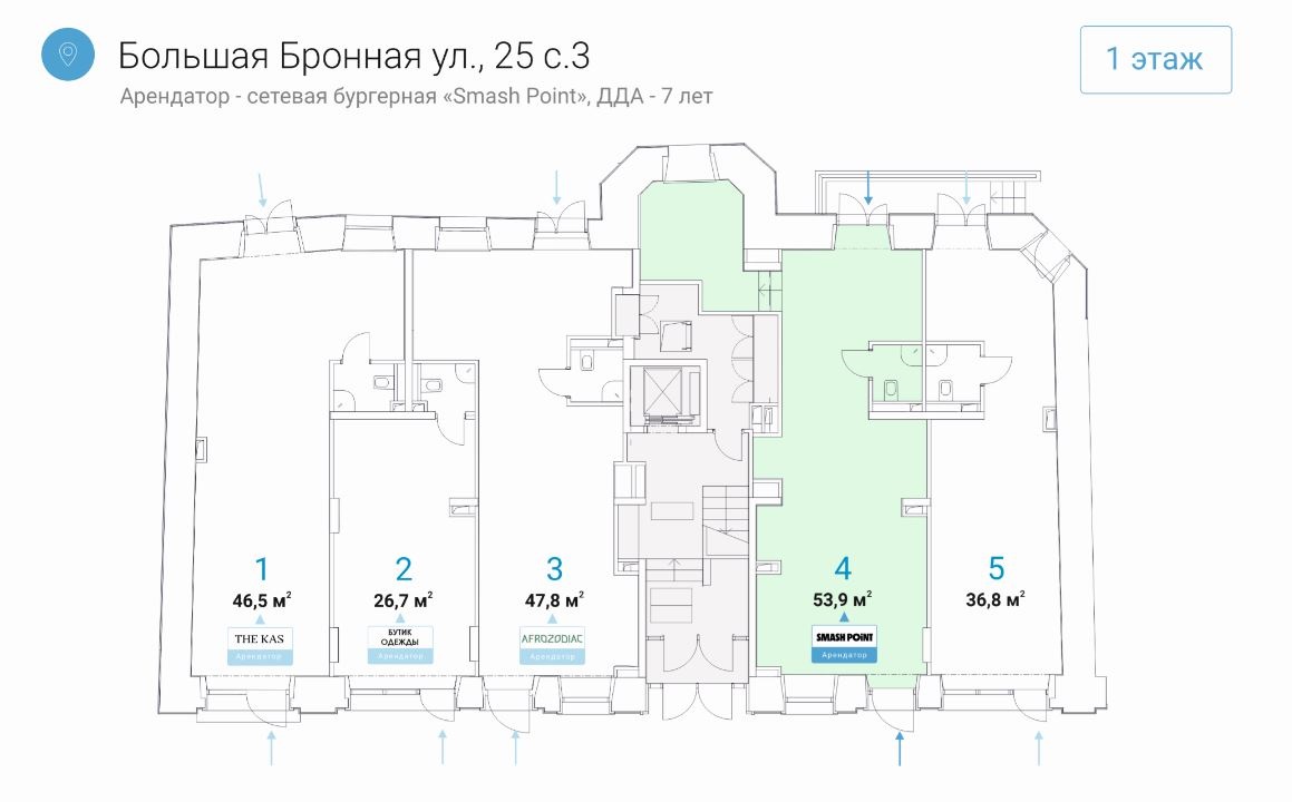 Номер лота на нашем сайте: 44164. Предлагается на продажу помещение на улице Большая Бронная, ЦАО, г. Москва, в районе знаменитых Патриарших. Продажа помещения у метро. Объект расположен на первом этаже нежилого здания, в непосредственной близости от станции метро "Пушкинская" - 1-2 минуты пешком, а также в 2-3 минутах от станций "Тверская" и "Чеховская". Сверхинтенсивный пешеходный трафик. Развитая инфраструктура, крупный жилой и деловой район. Собственная парковка перед фасадом дома. Площадь помещения 53,1 кв.м. Планировка свободная, перекрытия ж/б, высота потолков 3,4-3,6 м. Арендатор: Smash Point бургерная новой концепции, не имеющая аналогов в России . Долгосрочный договор аренды на 7 лет, арендная плата 1 260 000 рублей в месяц, коммунальные платежи и электричество оплачиваются арендатором отдельно. Схема сделки: договор купли-продажи недвижимости (ДКПН).