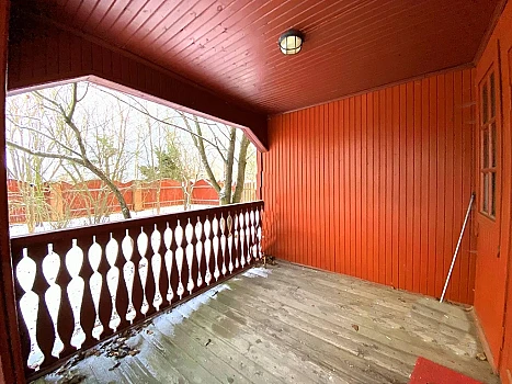 На первом этаже - открытая терраса для отдыха на воздухе. В самом доме за металлической входной дверью - прихожая, просторная кухня-столовая, гостиная с металлической печью, санузел с горячим водоснабжением и установленной сантехникой.
