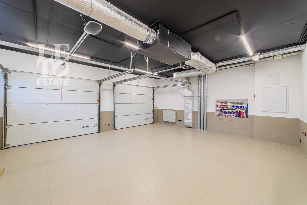 Первый этаж - прихожая, гардеробная, кухня-столовая-гостиная с камином и выходом на террасу, санузел с душевой, выход в гараж на два автомобиля