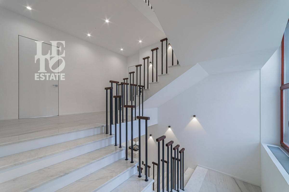 Напольное покрытие в гостиной и местах общего пользования выполнено из широкоформатной плитки, а лестница отделана натуральным мрамором. В спальнях покрытие пола выполнено из канадской инженерной доски Coswick.