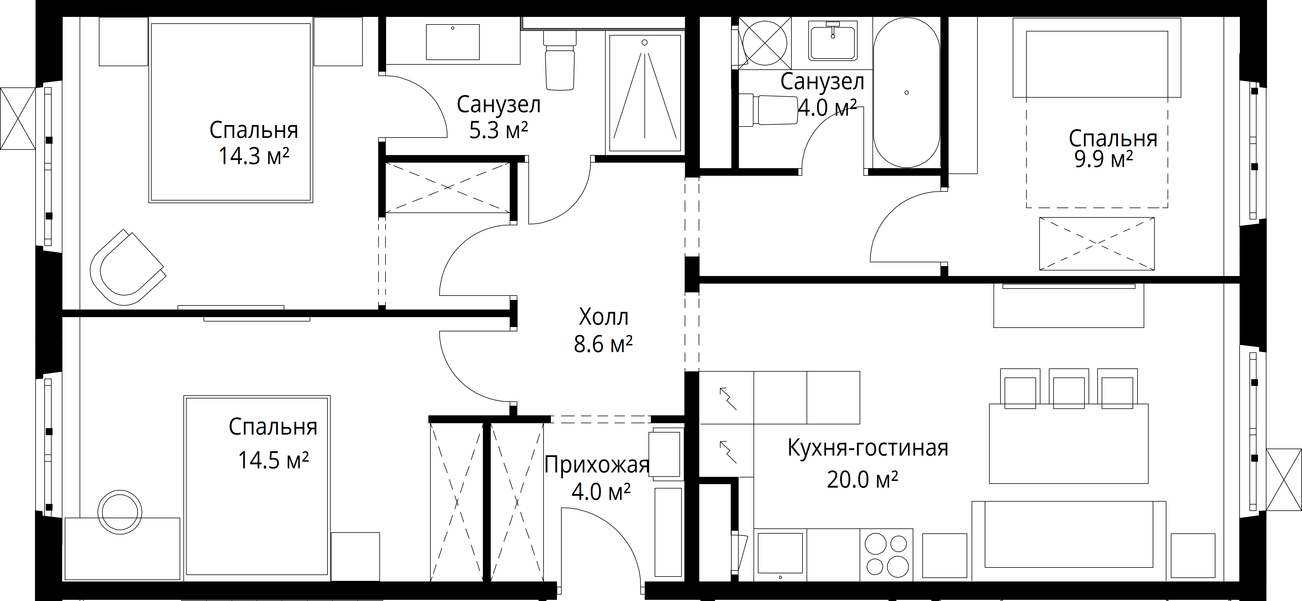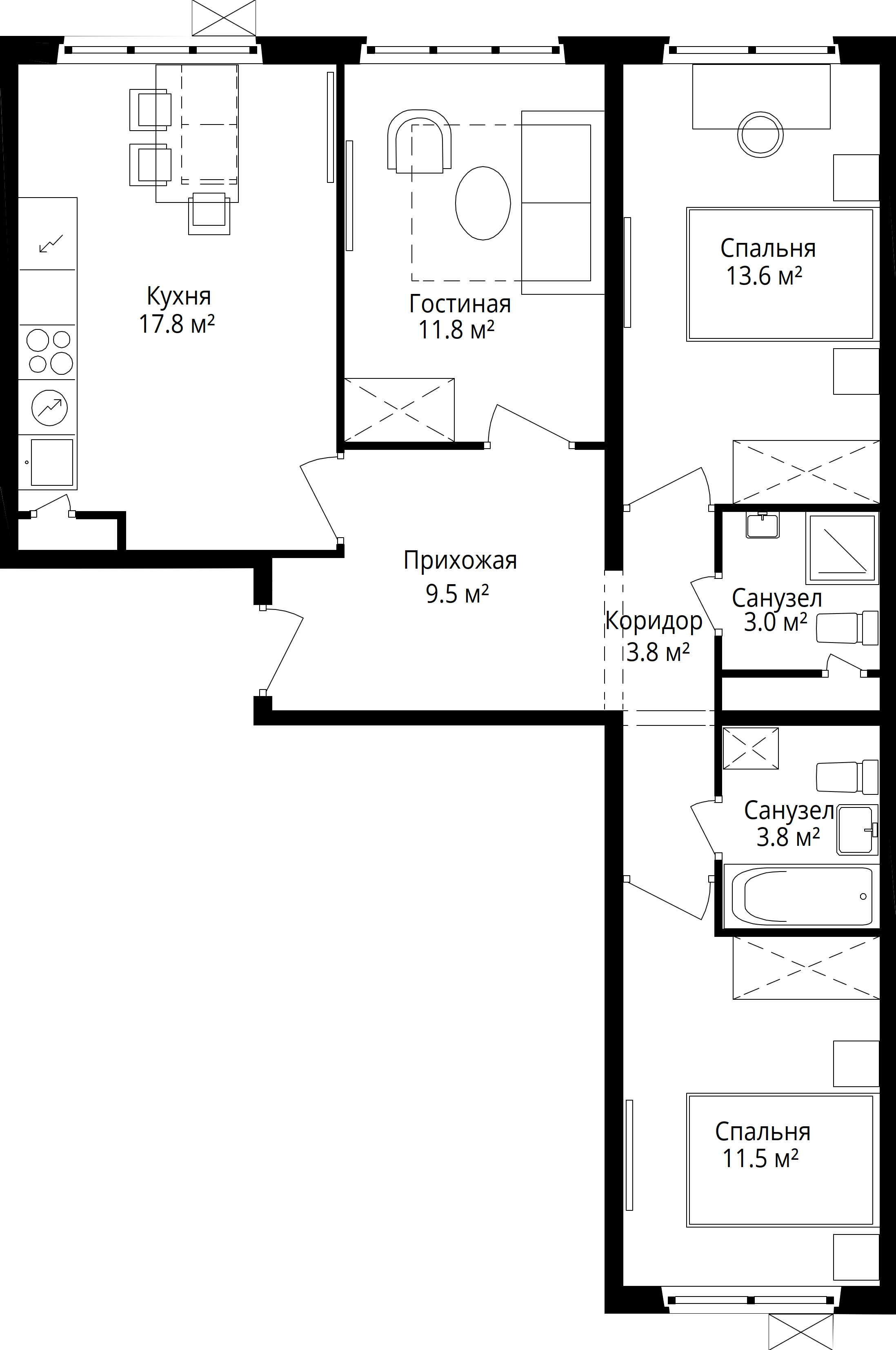 Квартира не угловая, с потолками 3 метра и одной лоджией 8 кв.м. По первоначальному проекту комнаты 15-16-18, кухня 13,5 с холлом 20 кв.м. За 7 лет с момента возведения дом сел, что позволяет делать ремонт без опаски за дальнейшие повреждения в силу усадки.