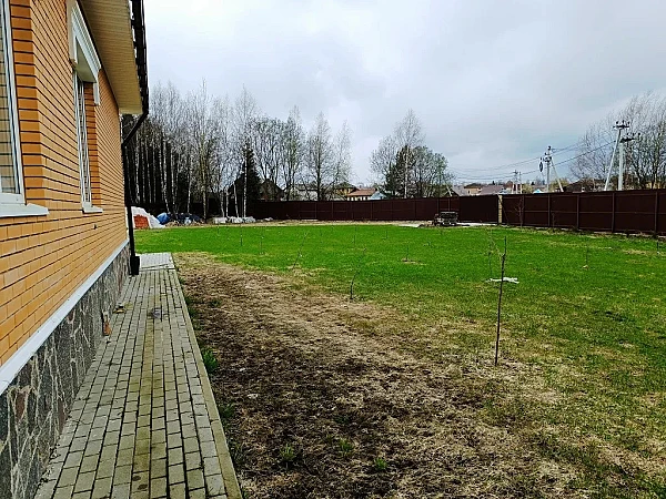 Участок: высажен молодой сад и газон на геотекстиле, завезен хороший грунт. Два заезда на участок через автоматические ворота. Огорожен двухцветными профлистом и штакетником на фундаменте. Крайний к лесу. Выполнен дренаж вокруг дома.
