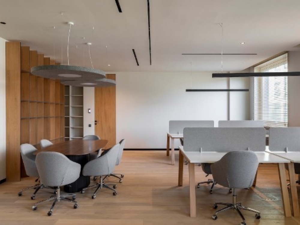 . Отделка: потолок – звукопоглощающие и декоративные панели; стены – шпонированные панели и декор; пол – фальшпол, инженерная доска, ковролин, керамогранит.