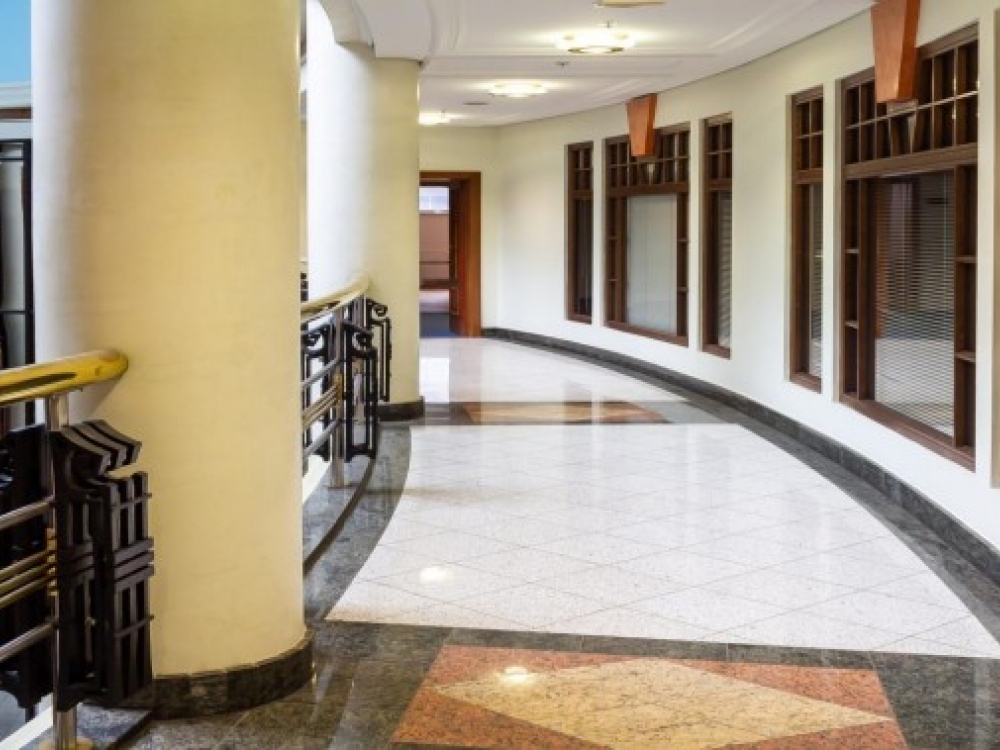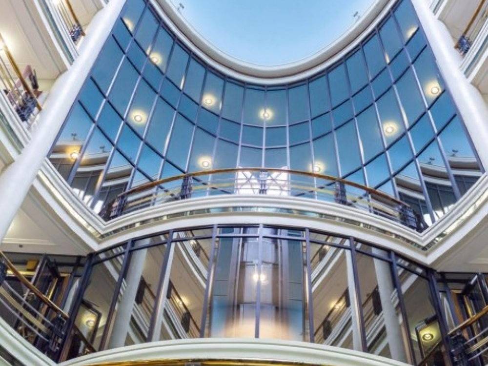 . Большой и светлый атриум с двумя панорамными лифтами.