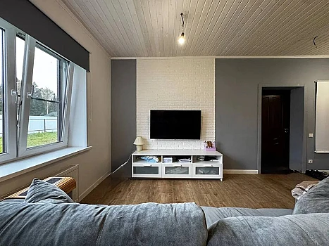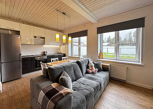 "Уютный каркасный дом в стиле ""Лесная сказка"" общей площадью 118 м2. Участок 6 соток, д. Лопотово. Внутри — 3 спальни.