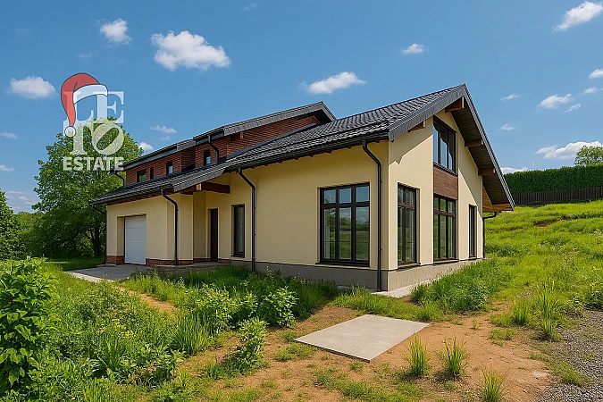Первый этаж – прихожая, кухня-столовая, объединённая с гостиной с выходом на патио, гардеробная, санузел, две спальни или спальня и кабинет со своим санузлом, гараж на 2 машиноместа, кладовка, котельная-бойлерная.