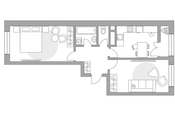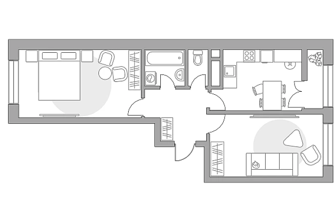 Жилая площадь 30.53 м2, кухня 11.93 м2. Площадь комнат: 15.35/15.18 м2, чистовая отделка, лоджий - 1.