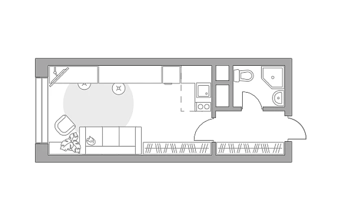 Жилая площадь 17.57 м2, кухня 1.87 м2, черновая отделка, комнаты смежные, окна выходят во двор.