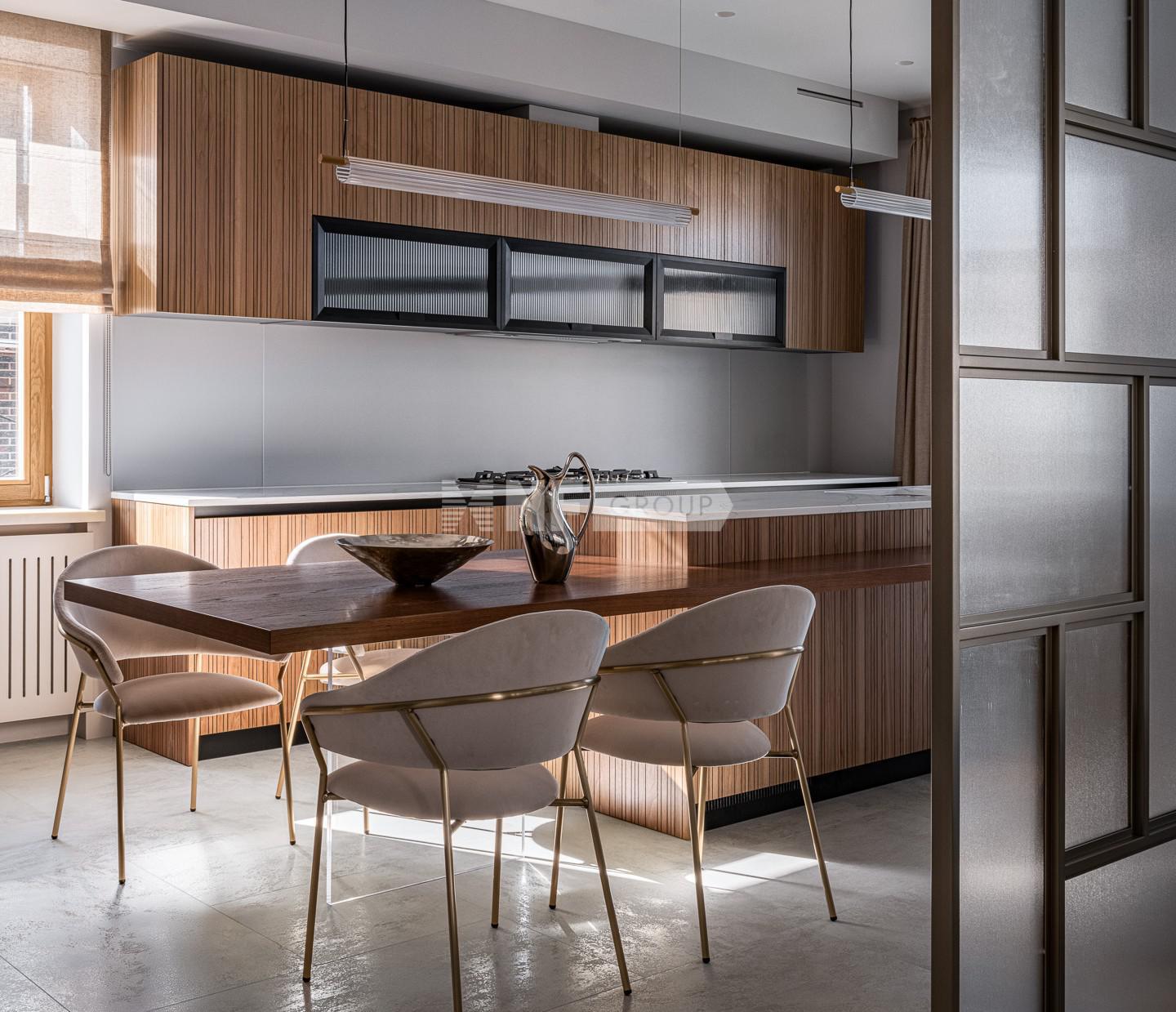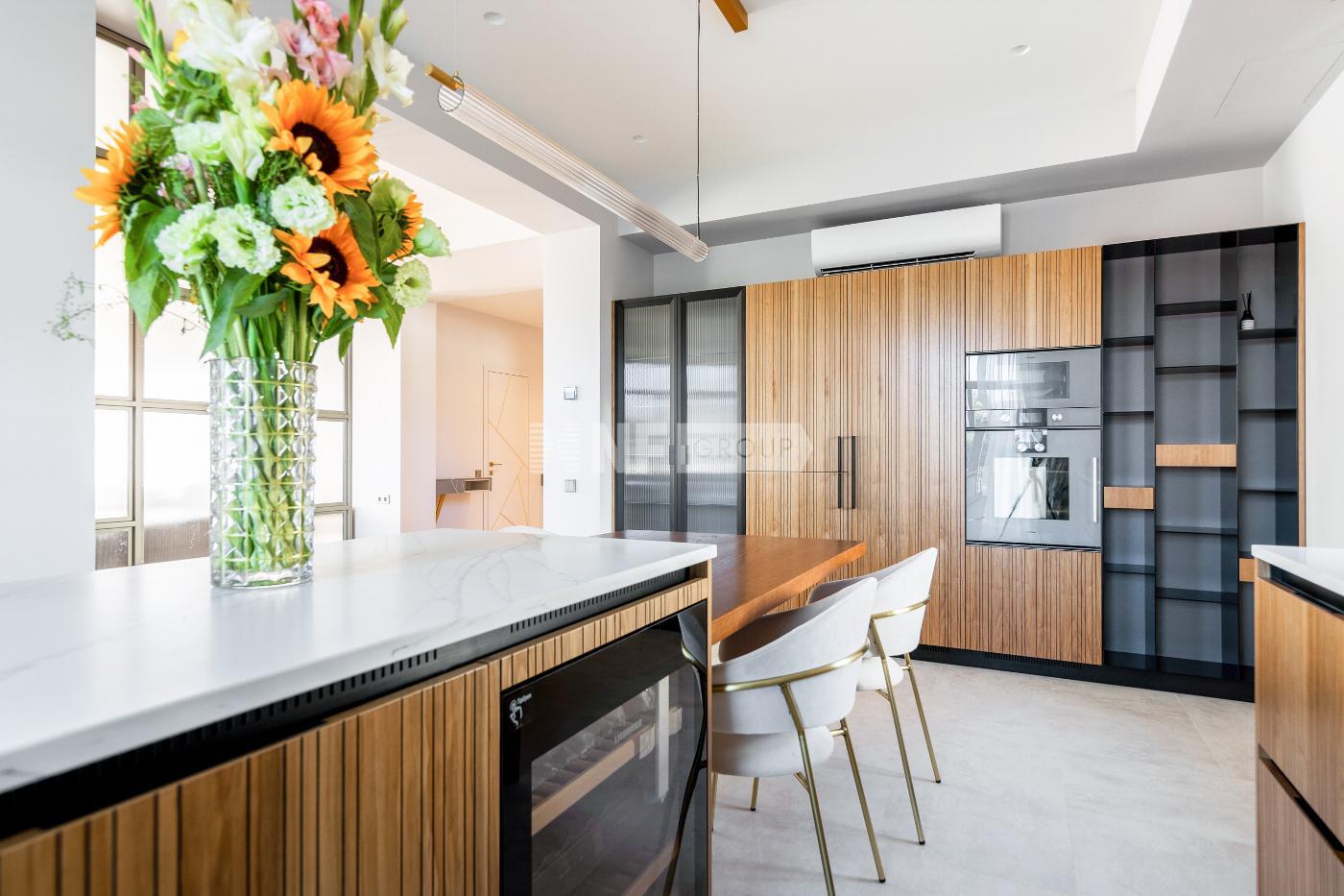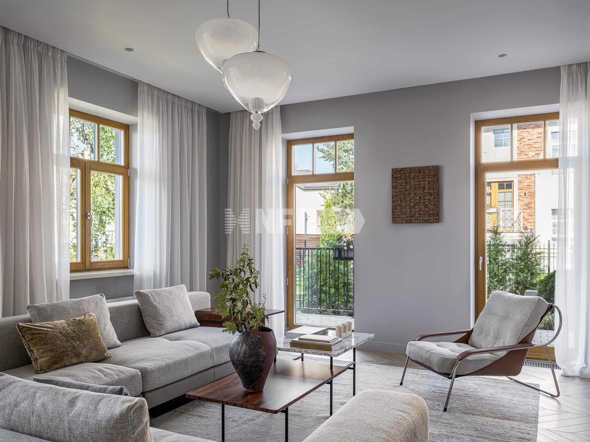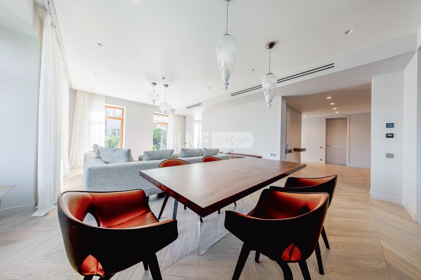 Современный интерьер сочетает светлые оттенки стен, дубового паркета и ярких акцентов в виде каминного портала из цельного куска каррарского мрамора, мебели из палисандра ручной работы, дизайнерской мебели ведущих итальянских брендов Cassina, Poltrona Frau, Pianca, кухня оборудована бытовой техникой Gaggenau.