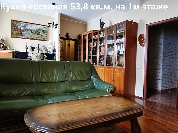 На первом этаже расположены: кухня-гостиная 53,8 кв.м., лоджия 3,4 кв.м., балкон 3,4 кв.м., санузел 3,5 кв.м., прихожая 12 кв.м.