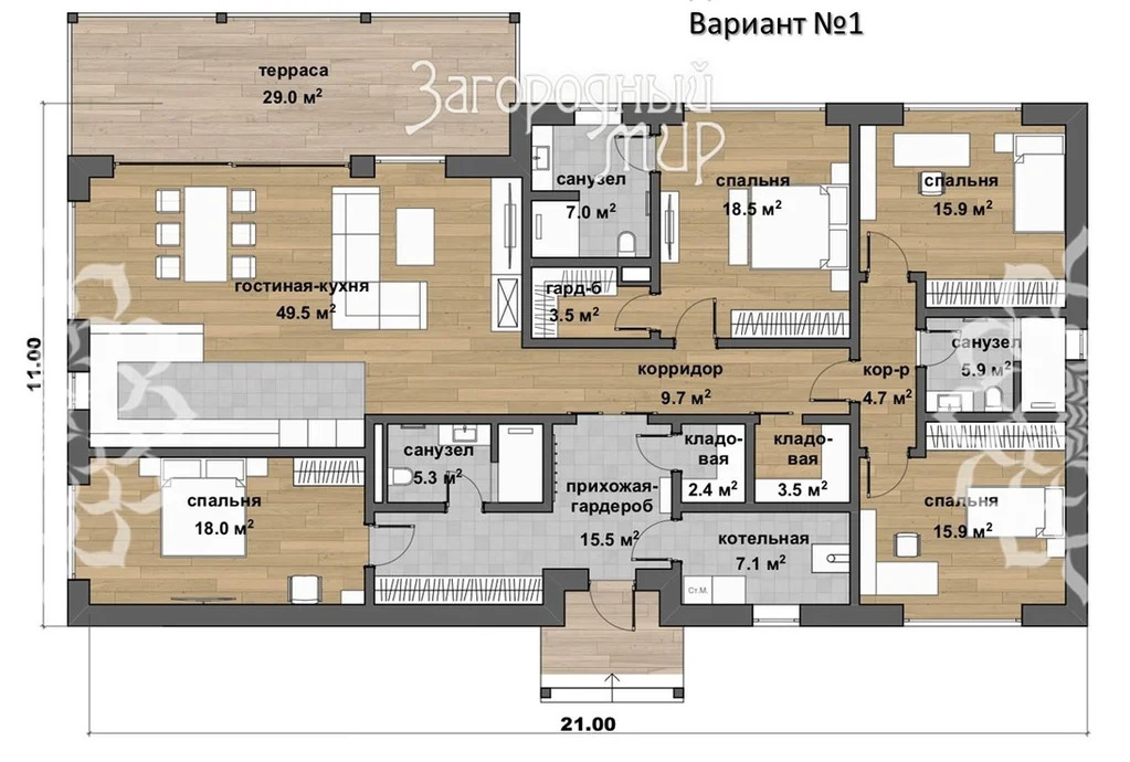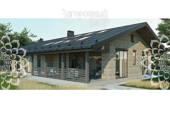 Построенный из красного керамического кирпича Porotherm, внешне дом отделан облицовочным кирпичом. Кровля - металлическая фальцевая с утеплением 20 мм, окна - панорамные двойные стеклопакеты 76 мм, фундамент - железобетонная плита. В доме запланированы: гостиная-кухня, 4 спальни, 3 с/у, бойлерная, прихожая, гардеробная, кладовая. Возможна пристройка террасы, а также дополнительных строений: баня, навес, хозблок в едином архитектурном стиле КП