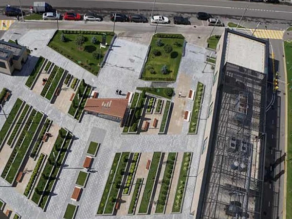 Площадь перед входом украшена газонами, деревьями и цветами.