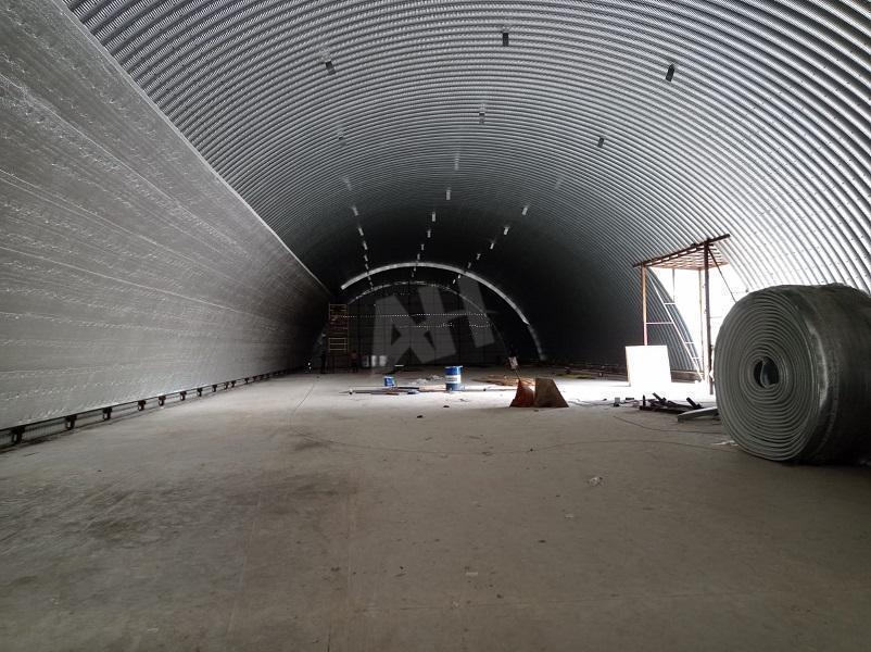 2.Производственно-складское здание площадью 1650 м2. Конструктив здания- каркасный арочный ангар-полусфера из алюминиевого проката, усиленного ребрами жесткости, и утепленный топофолом- теплоизоляцией из несшитого вспененного полиэтилена. Габариты склада 92 м х18 м, рабочая высота корпуса в коньке 12 м, допустимая нагрузка на бетонный пол с антипылевым покрытием 8 тн/м2, двое ворот нулевого уровня с габаритами 4,4 х 4 м и 6 х 5,5 м. Погрузо-разгрузочная площадка между цехом и ангаром оснащена кран-балкой гп 10 тн и служит весомым подспорьем для сокращения технологических издержек по погрузке/разгрузке материала и продукции.