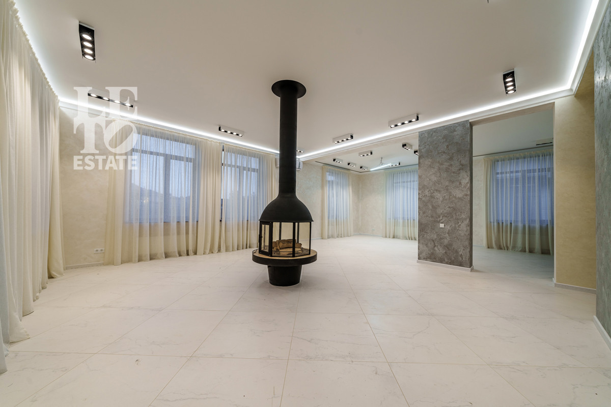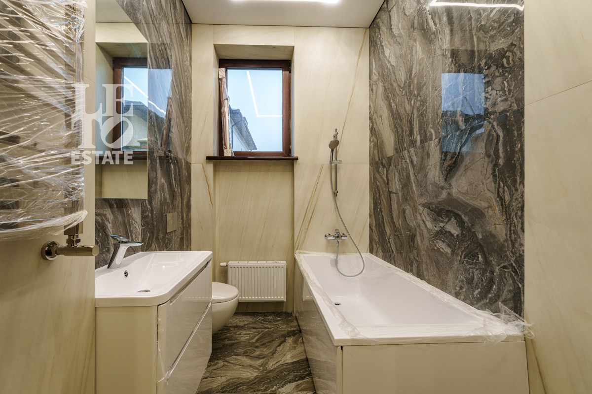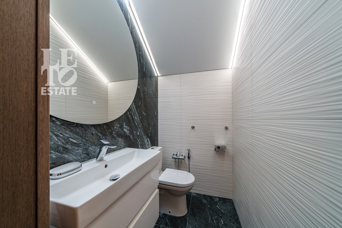 В основном доме на первом этаже можно оборудовать две спальни, на втором этаже три спальни. Отделка стен выполнена декоративной штукатуркой, использованы натуральные материалы для лестницы и дверей - дуб, пол - инженерная доска. Теплые полы разведены на первом этаже, на втором этаже в санузлах. Установлено кондиционирование.