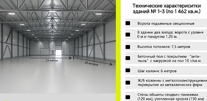 Сетка колонн 18х24. Установлены система пожаротушения (спринклерная). Охраняемая и огороженная территория. Круглосуточный режим работы 24\7.