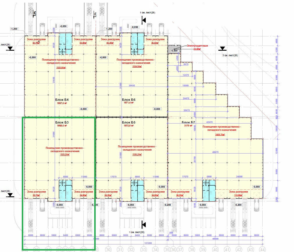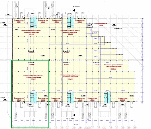 Комплекс представлен в виде 8-ми одноэтажных зданий с антресольным этажом на отметке +4,5м. Площадь производственно-складских помещений варьируется от 656,31 м2 до 2681 м2. В состав блока входят: зона разгрузки, помещение производственно-складского назначения, пространство антресоли для хранения тары; мест общего пользования (лестница, комната отдыха персонала, раздевалка, гардеробные, душевые, технические помещения).