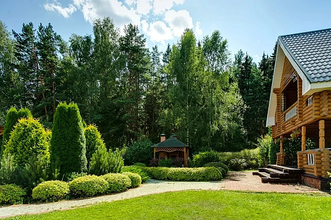 Территория дома граничит с лесной зоной, утопая в зелени.
