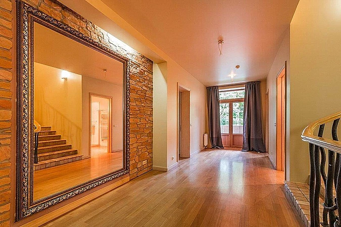 Общая площадь особняка 1040 метров, состоит из двух зеркальных половин по 520 метров. Расположен на огороженной территории на участке 14 соток, включая землю под особняком. Имеется парковка (4-6 мест на подземном паркинге + 4-6 мест на территории, а также общая парковка на прилегающих улицах). Часть особняка огорожена кирпичным забором и вековыми высокими деревьями. Собственная котельная, остальные коммуникации городские. Срок сделки от 4-6 месяцев после договоренности сторон. Есть арендатор.