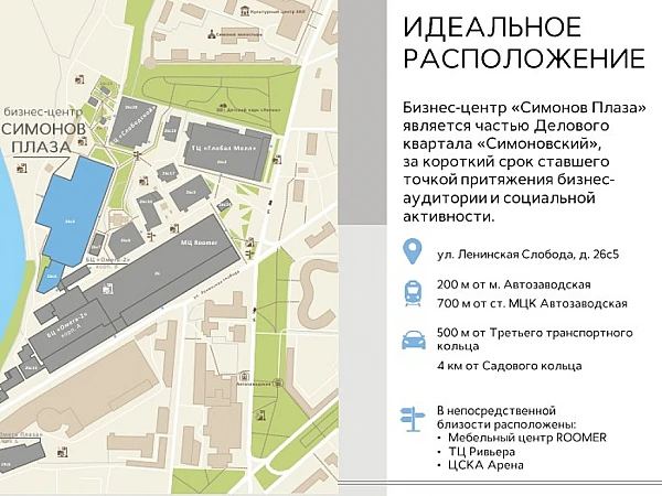 Здание расположено в 4 минутах пешком от станции метро Автозаводская. Удобный доступ на автомобиле – с обеих сторон