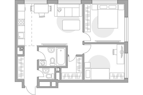 Жилая площадь 45 м2, кухня 5.04 м2. Площадь комнат: 19.34/13.32/12.34 м2, квартира без отделки, окна выходят на улицу.