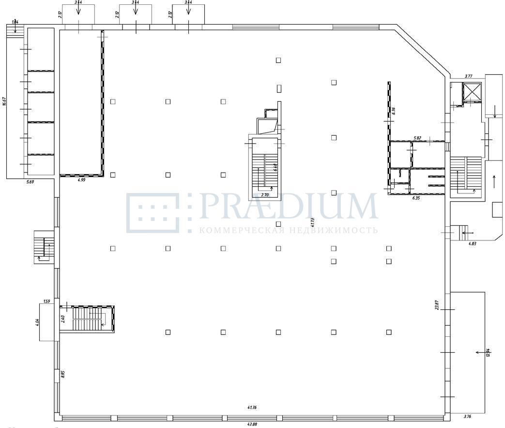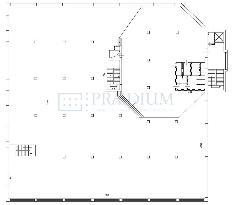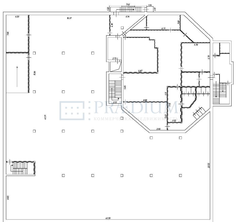 Здание содержит: -1 этаж- 1 713 м2, 1 этаж - 1 772.3 м2, 2 этаж -1 729 м2, 3 этаж - 477.6 м2, 4 этаж - 419.2 м2, тех. этаж - 35.4 м2