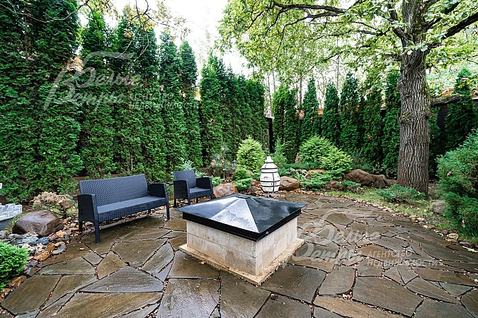 - Павильон с летней кухней 56 кв.м из камня, в стиле основного дома. Пол отделан керамогранитом (Испания) (теплый водяной пол). Кухня с русской печью, мангалом и профессиональной вытяжкой. Дровяная плита дублируется индукционной плитой.