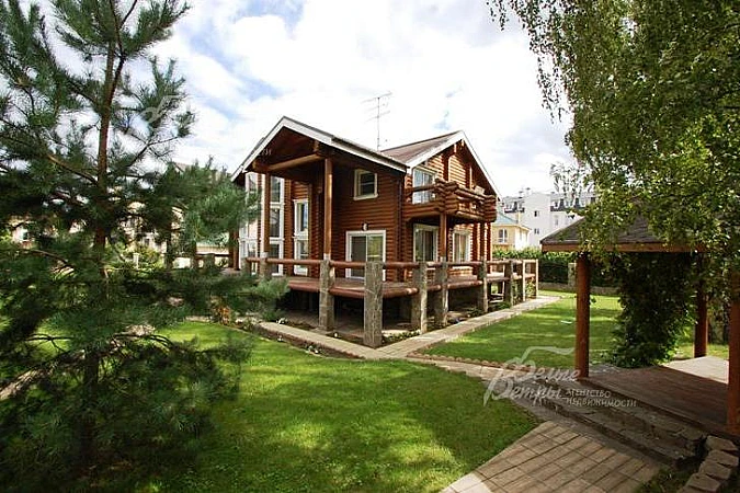 Красивый деревянный (бревно) дом с большой площадью остекления в обжитом строго охраняемом коттеджном поселке. Дом полностью укоплектован качественной мебелью и техникой. Высокие потолки, второй свет.Баня с купелью, гараж, детская площадка на большом участке с взрослыми лесными деревьями. Центральные коммуникации (газ), телефон, интернет.