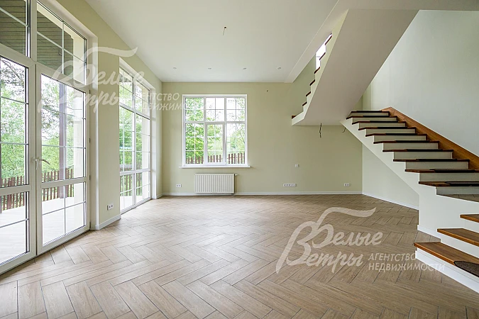 Внутренняя отделка: выполнена новая отделка под ключ. Стены: покраска, керамогранит в санузлах. Полы - ламинат, керамогранит с водяным подогревом, террасная доска на террасе. Потолки - гипсокартон. Лестница монолитная широкая, керамогранит, ступени покрыты деревом. Двери межкомнатные ламинированные..