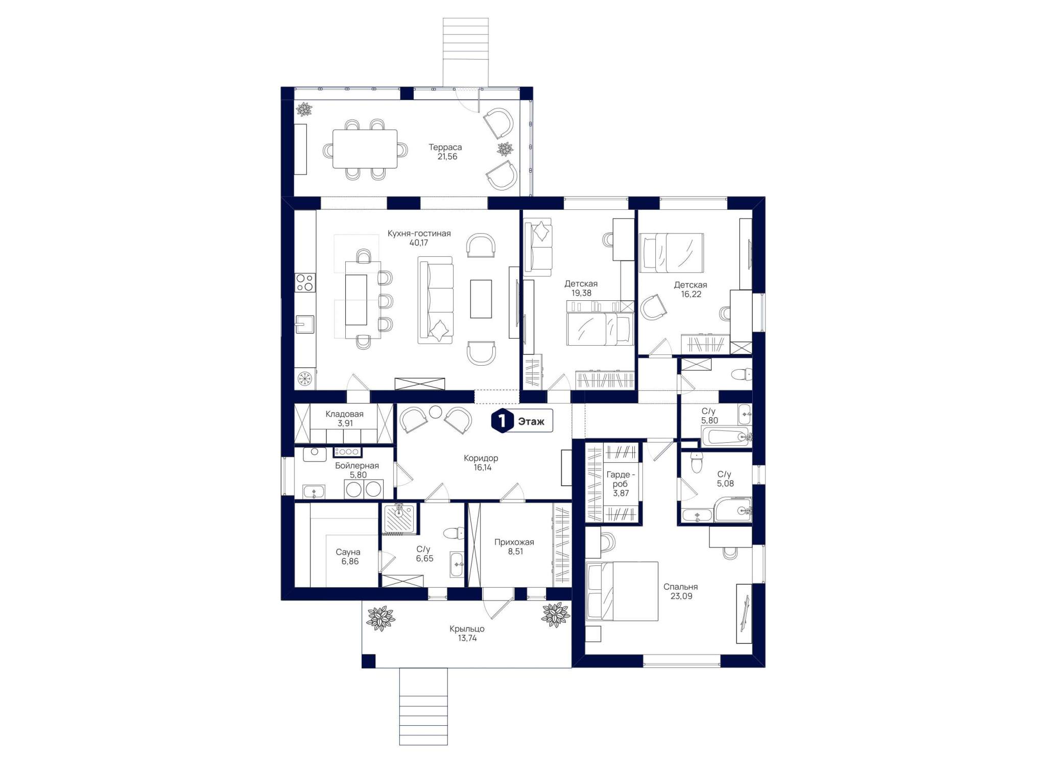 1-ый этаж: S - 115.7 кв.м: крыльцо 4.5 кв.м, холл 10.6 кв.м, гостиная 35.5 кв.м с выходом на террасу 18.6 кв.м, кухня-столовая 19 кв.м, спальня 12 кв.м, гардеробная с котельной 10.6 кв.м, санузел 4.5 кв.м.