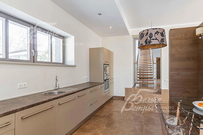 Мебель, оборудование: мебель BoConcept, Flou и других известных брендов. Спальни оборудованы просторными кроватями, диванами, тумбами, туалетными столиками. Гардеробные комнаты оборудованы системами для хранения вещей. Установлена кухня со встроенной техникой (духовой шкаф, варочная поверхность, посудомоечная машина, вытяжка), двухкамерный холодильник. Стиральная машина, пылесос, телевизор. Вся сантехника установлена: туалеты, ванны, биде, раковины, душевые кабинки - все известных европейских брендов. На первом этаже открытые панорамные окна. На втором этаже в всех спальнях есть карнизы и шторы. Дом украшен картинами, оригинальными предметами интерьера..