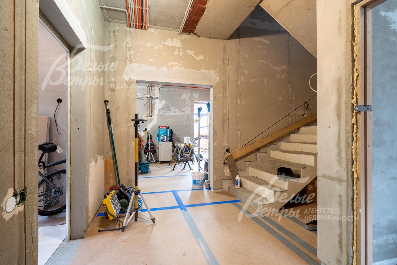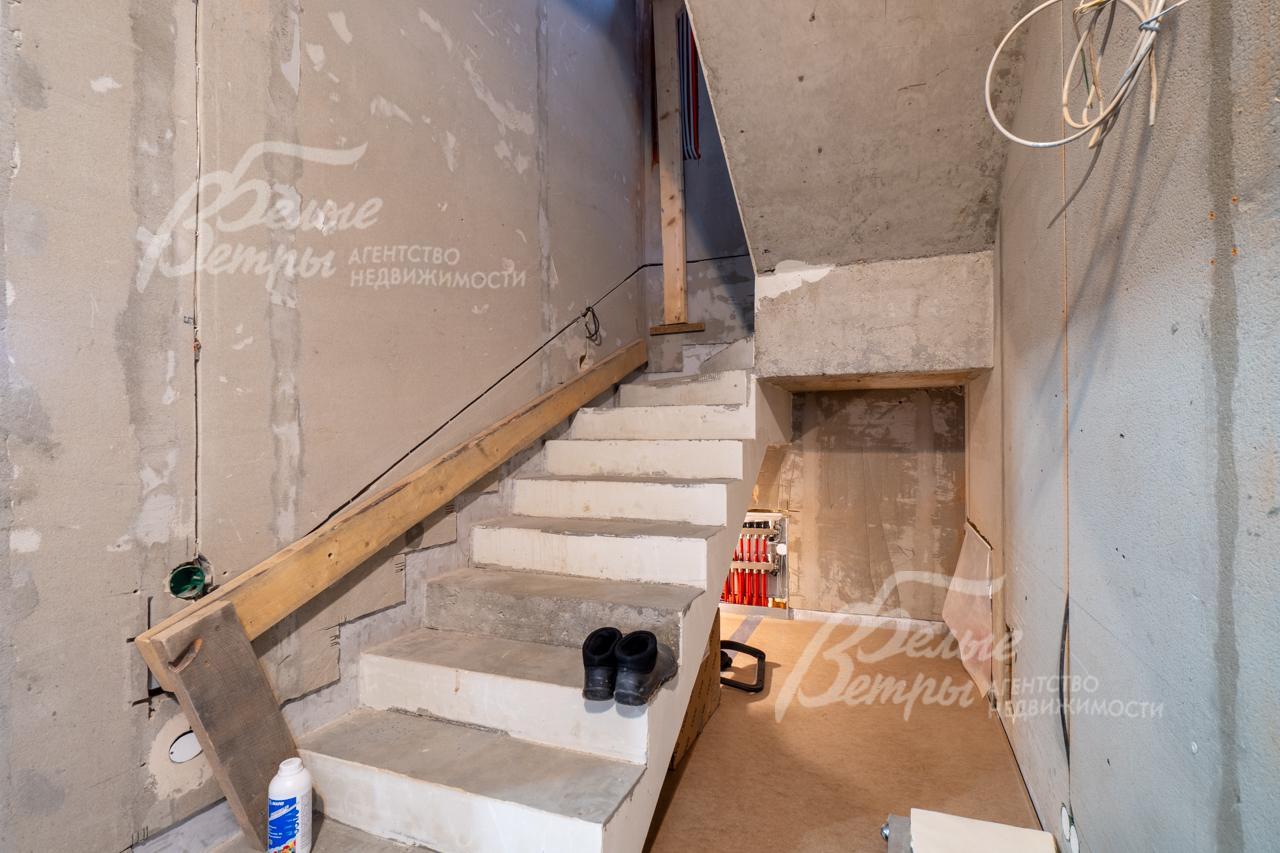 Внутренняя отделка: под финишную отделку. На стенах шпаклёвка под покраску. На полу керамогранит и плитка - на пером этаже и в санузле второго этажа. Закуплено кварц-виниловое покрытие для комнат второго этажа. Монолитная лестница шириной 90 см. Коммуникации разведены до точек, водяной тёплый пол на 1-м этаже и в санузле на 2-м. Входная алюминиевая дверь с терморазрывом высотой 2.5 м..