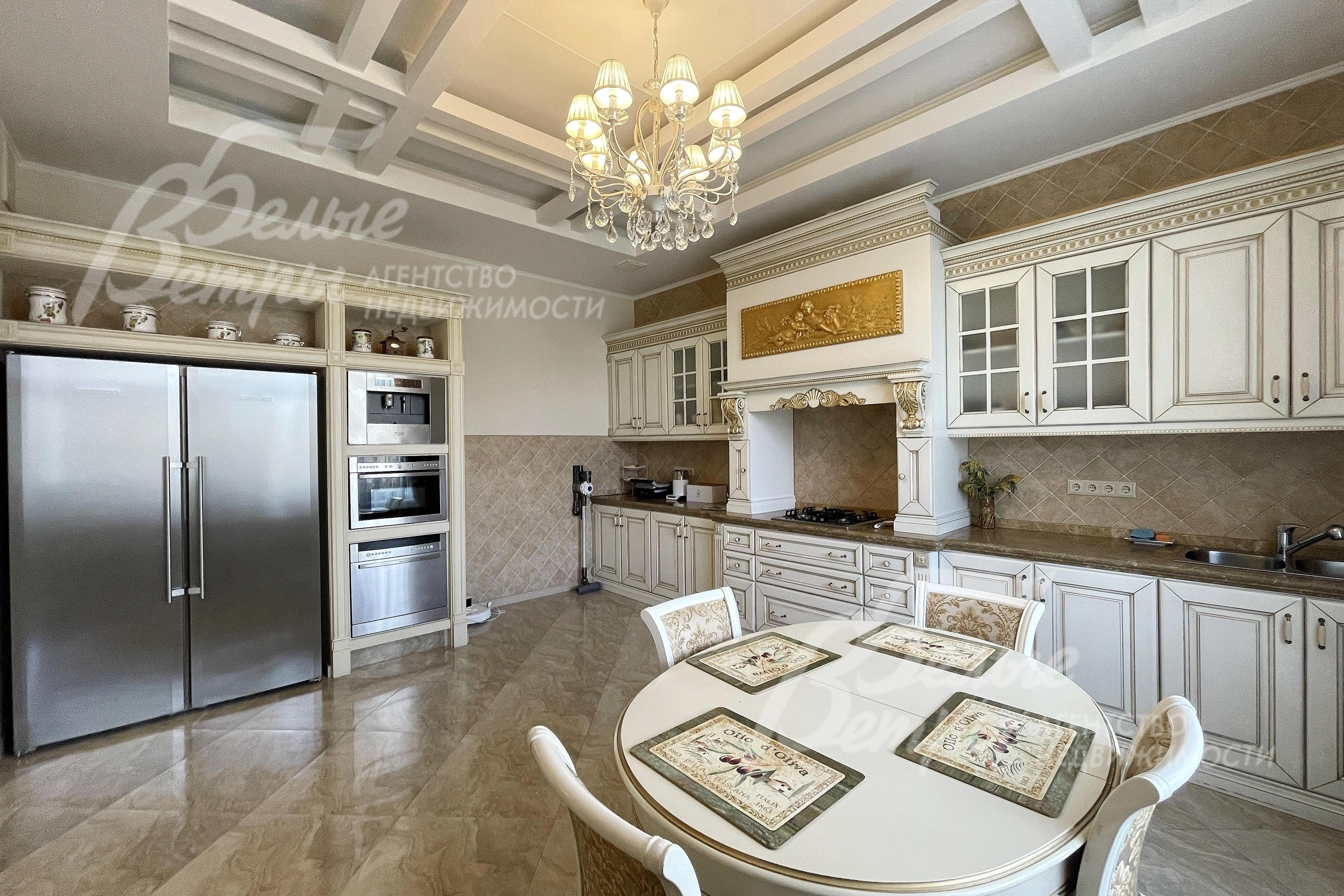 Мебель, оборудование: дом обставлен импортной привозной мебелью в классическом стиле. Установлен кухонный гарнитур из массива ольхи со столешницей из натурального мрамора с большим декоративным порталом в классическом стиле, со всей необходимой бытовой техникой: большой холодильник и посудомоечная машина Liebherr, кофемашина и духовой шкаф с СВЧ Ariston, газовая варочная панель. Эффектная барная стойка с колонной и подсветкой, разделяющая кухню и столовую. Везде итальянские люстры и светильники. Много эксклюзивного декора и подсветки..