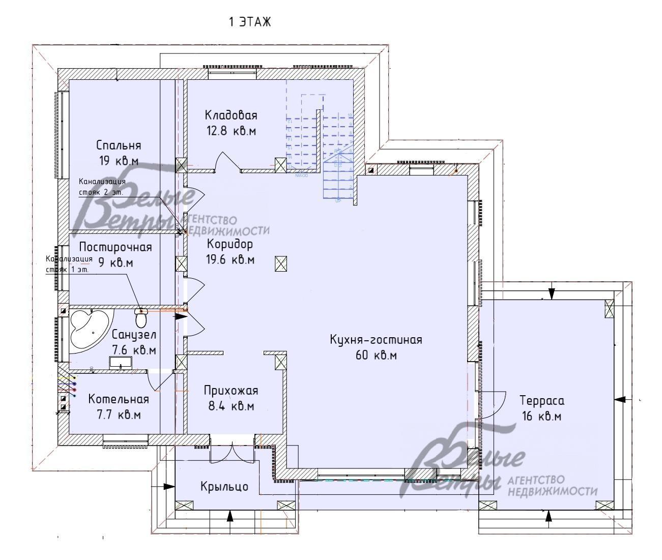 1-ый этаж: крыльцо, холл, котельная, санузел, гардеробная, спальня, кладовая, кухня-столовая-гостиная, крытая терраса 32 кв.м..
