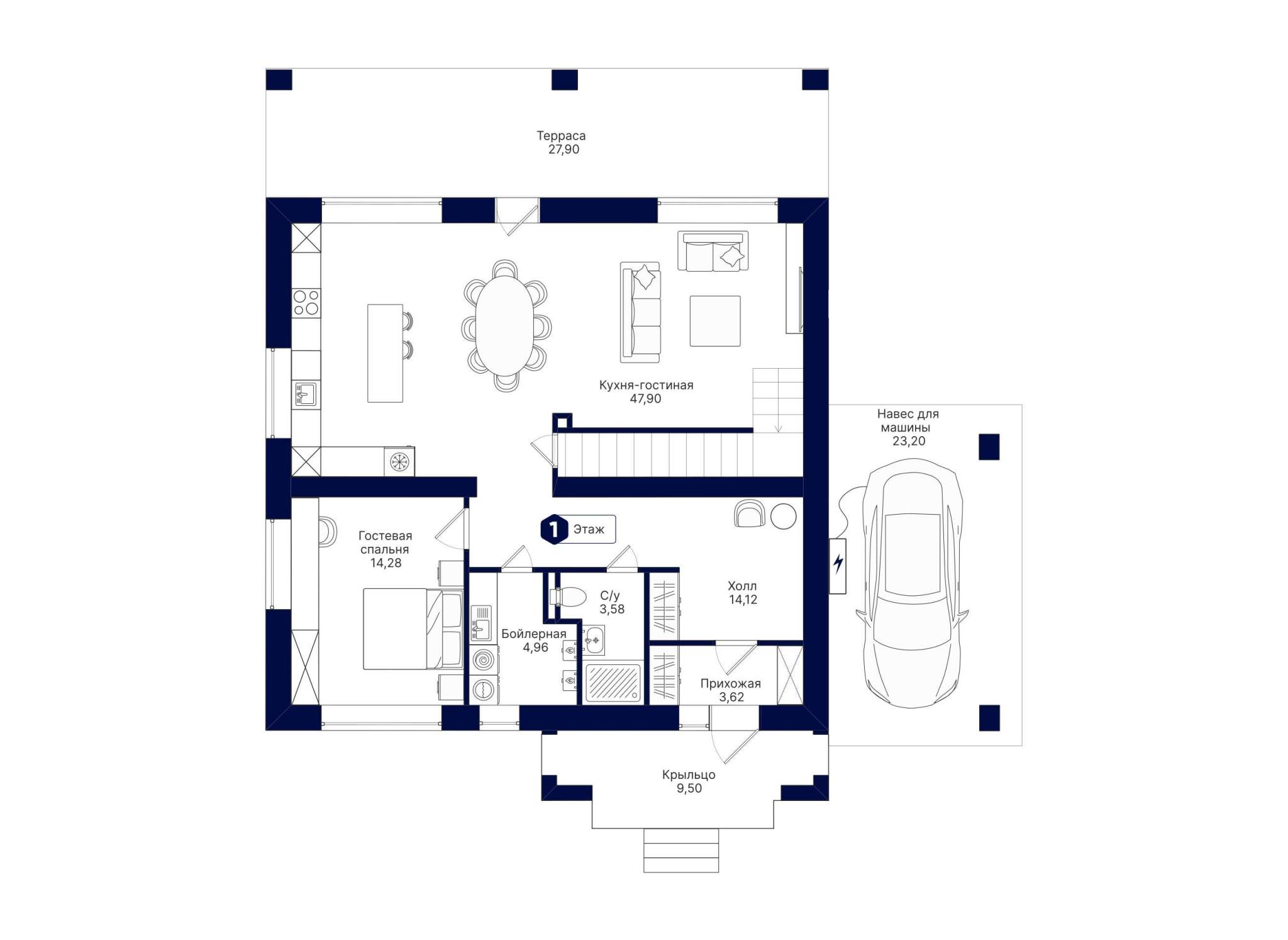 1-ый этаж: котельная 6 кв.м, прихожая 18 кв.м, гардеробная 5.6 кв.м, коридор 5 кв.м, кухня-гостиная 43.5 кв.м, санузел 5 кв.м, спальня 18 кв.м, кабинет 10.6 кв.м, постирочная 5 кв.м, кладовая 2 кв.м.