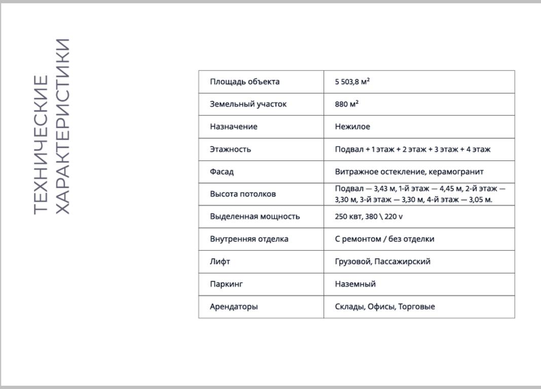 Инфраструктура здания включает пассажирский и грузовой лифты. Объект обладает заметным рекламным потенциалом. Площадь земельного участка составляет 880 м². Высота потолков варьируется от 3 до 4,5 метров. Мощность электроснабжения — 250 кВт, все центральные коммуникации. Наличие арендаторов из сферы ритейла, офисов и складов.