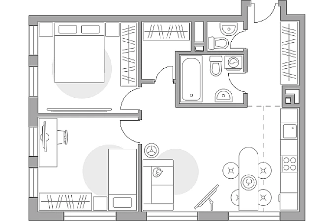 Жилая площадь 43.76 м2, кухня 5.01 м2. Площадь комнат: 18.44/12.84/12.48 м2, квартира без отделки, окна выходят во двор.