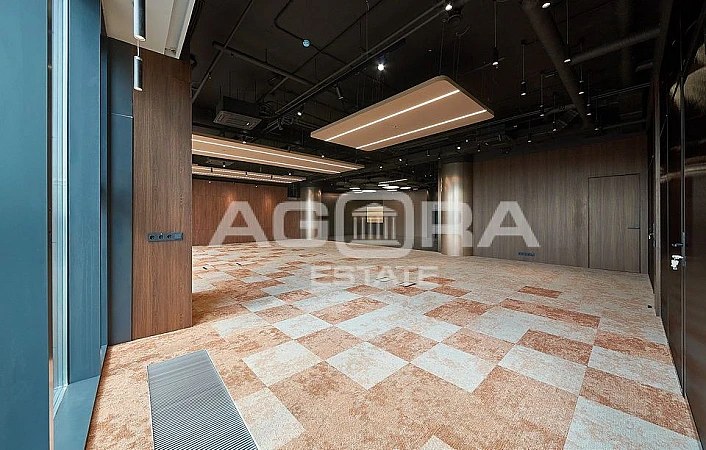 Смешанная планировка: входная зона, две переговорные, кабинет, кухня, гардеробная и опенспейс. Высокие потолки - 4 м, панорамные окна по фасаду, виды на набережную.