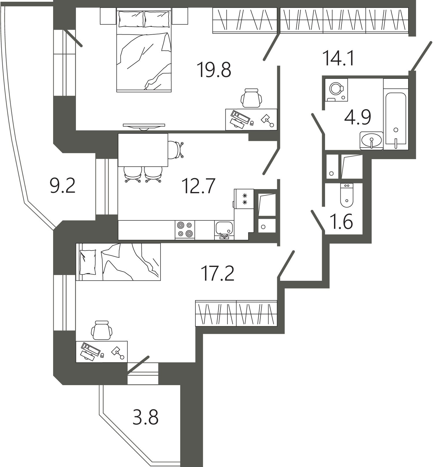 Жилая площадь 50.3 м2, кухня 11.5 м2, квартира без отделки. Установлены межкомнатные перегородки. Установлены деревянные входные двери. Окна- пластиковые, с двухкамерным стеклопакетом. Балконы и лоджии с остеклением. Электроснабжение- установлен квартирный электросчётчик(без внутренней разводки). Сантехника-стояки без внутренней разводки с установкой водосчётчиков. Отопление- конверторное, с установленными радиаторами.