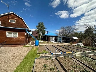 Бревенчатая русская баня, вода также заведена, новый хозблок, парник, навес оборудовали для беседки.