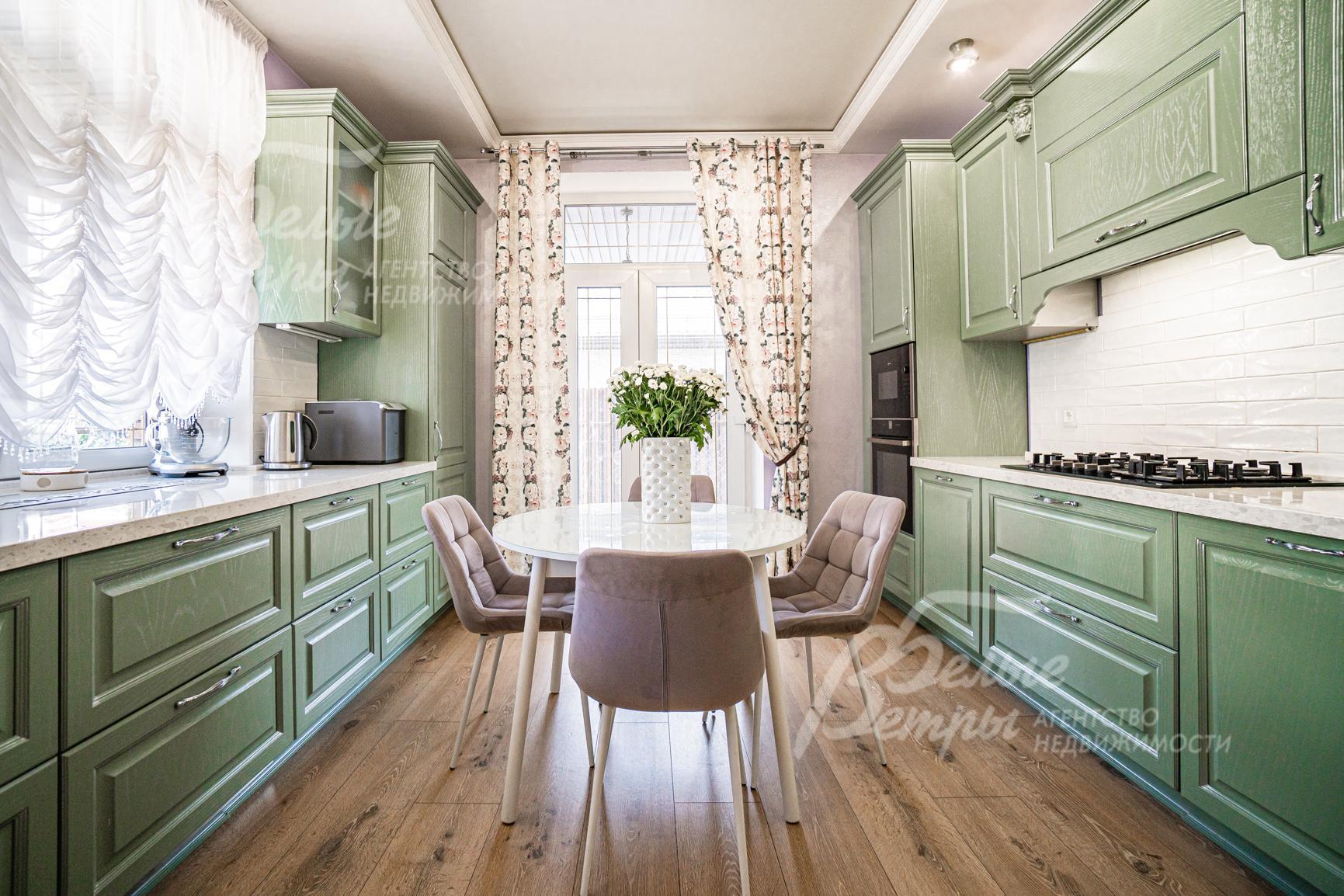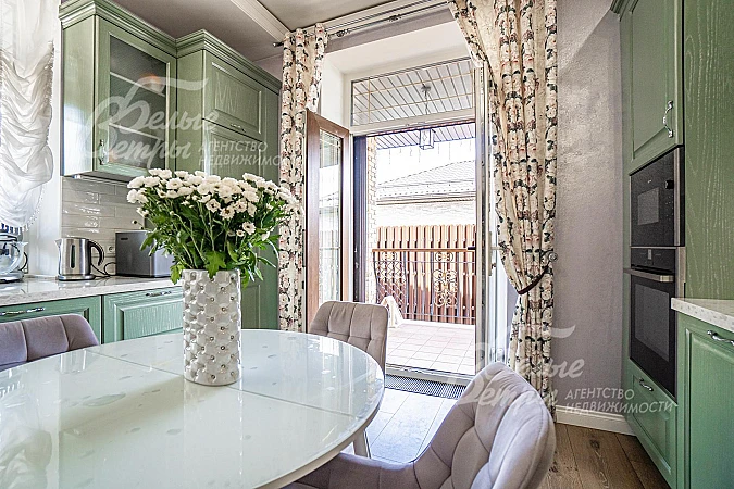 Мебель, оборудование: вся мебель в доме сделана на заказ, из дорогих пород дерева. Кухонный гарнитур из массива ясеня, фасады с резьбой, столешница выполнена из искусственного камня. На кухне встроенная техника фирмы Neff (Германия): газовая плита с 5-ю конфорками, СВЧ и духовой шкаф, высокие морозильная и холодильная камеры. Диван в гостиной выполнен с каретной стяжкой. Стиральная и сушильная машины фирмы Asko (Финляндия)..