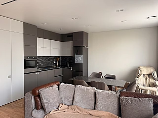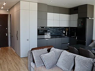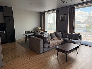 На данный момент в квартире дополнительно установлено дизайнерское освещение, текстиль, частично завезена мебель.