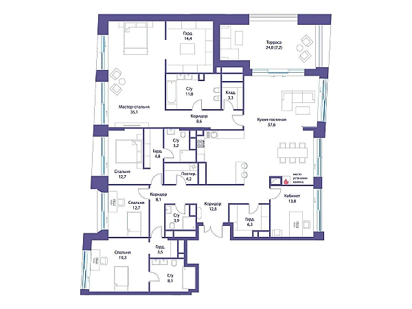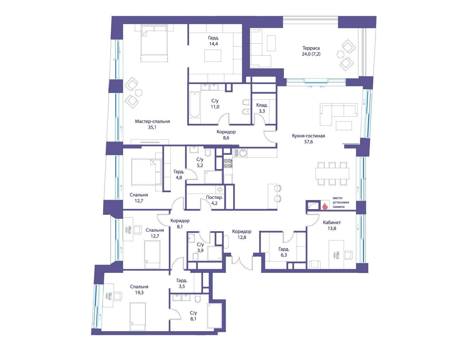 В квартире продуманная функциональная планировка с просторной кухней 57.60 м2. Жилая площадь - 93.60 м2. Высота потолка от 3,65 м. Изолированные комнаты, 4 совмещенных санузла. Окна на смежные стороны. Виды на природный парк и реку.